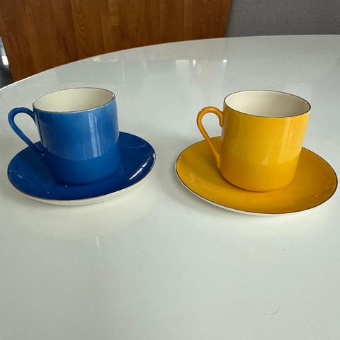 Arabian Spektri -mokkakupit & aluslautaset, molempia 8 kpl. Kupin vetoisuus noin 0,5 dl, lautasen halk. 11cm. Kissatalous. Vain nouto. Kulkeutuu omien menojen mukaan esim. Pukinmäki, Herttoniemi, Viikki