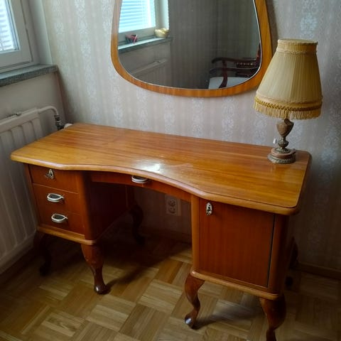 Tosi ihana vanhan ystävälle silmäruokainen pöytä...sopii laittaa minnevain vaikka tv pöydäx-firmaan kukkakauppaan .esim..ym..komeat jalat ja laatikossa alkuper avain ja nuppineula teline joka käännetään tarvittaessa esille...olemme pohjamaalannut sen valkeaksi ja pinnassa tapetti vaihtunut aina sävyjen mukaan missä huoneessa se on meillä kulkenut vaihtoehtoisesti tarpeen mukaan...eli!!!uuteen kotiin voi helposti maalata kalkkimaalia oman sävyn mukaan.....joka kuivuu nopeesti ..neuvot saa samaan hintaan. Historiaa.....On niin kaunis pöytä malli mutta meillä jo tarpeeton...puun laatu hyvä...ollut siis alkuper ompelupöytä ja alaosassa ollut jaloille pehmuste jonka paikalle me laitettu lauta johon saa maljakoita-kukkia-akuankka lehtiä tai muuta...nouto itäkeskus-porvoo- kuvassa rekvisiittaa osa joka ei myynnissä---mutta peilit ja mosaikki lyhty myynnissä eri hintaan....