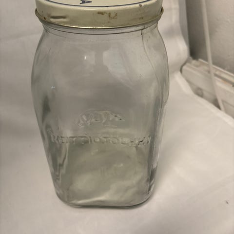 Iittala Karhula lasinen säilytyspurkki metallikannella. Purkki on kirkasta lasia ja siinä on kohokuvioitu Karhula-teksti sekä karhulogo. Kansi on vaalea, pyöreä ja siinä on painettu Karhula-kuvio. Soveltuu esimerkiksi kuivatuotteiden, pienten keittiötarvikkeiden tai muiden pientavaroiden säilytykseen keittiössä tai kodin muissa tiloissa.