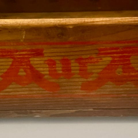 Hyväkuntoinen ja tukeva Auran panimon vanha puulaatikko. Ajan patina näkyy. Laatikon päädyissä lukee: laatikon omistaa AURAN PANIMO OY.
