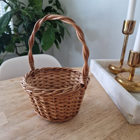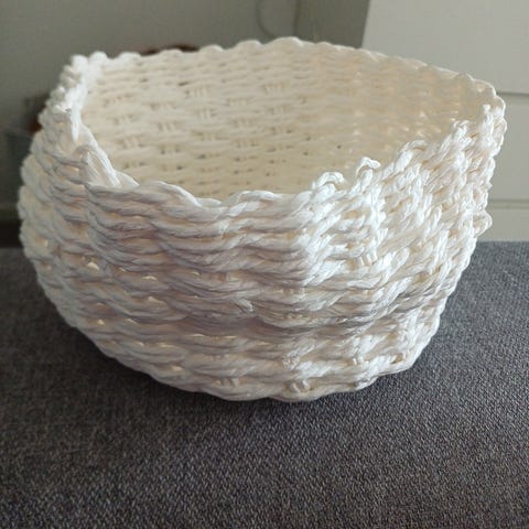 IKEA kori valkoinen. Pyöreä, avoin, punottu kori. Kori on kevyt ja sitä on helppo siirtää kahvojen avulla.