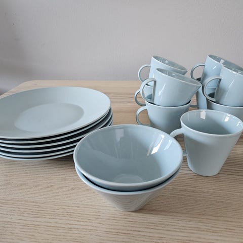 Syvä lautanen sekä kolme kulhoa. Pieniä käytön jälkiä näkyvissä