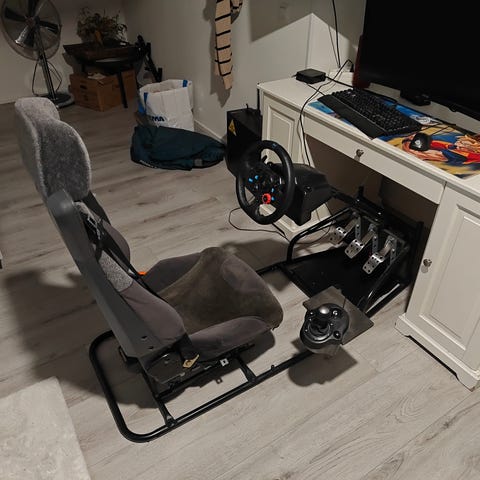 Myydään itse rakennettu simulaattorituoli, joka tarjoaa realistisen ajokokemuksen PC:llä ja osittain PlayStationilla.