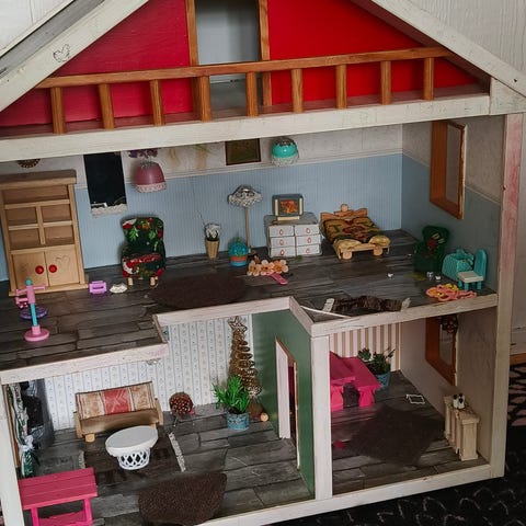 Play 2 learn nukketalo, saa kätevästi kasaan, paikoitellen leikinjälkiä, mutta yleisilme siisti. Muutama hahmo ja kaluste mukaan.