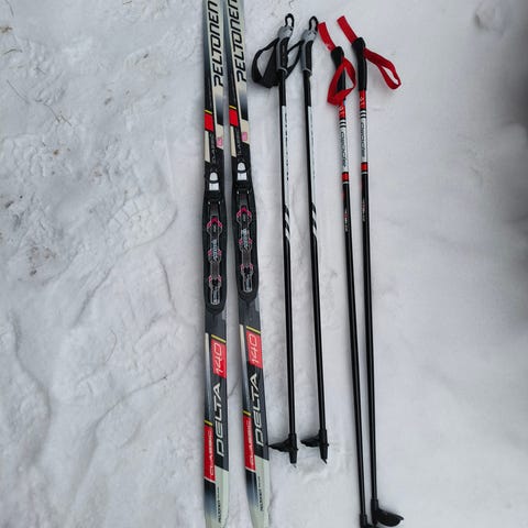 NNN Sukset 140cm ja 110cm, sauvat 114cm ja 85cm. NNN Monot kokoa 35, tarrakiinnitys. Tarjota saa!