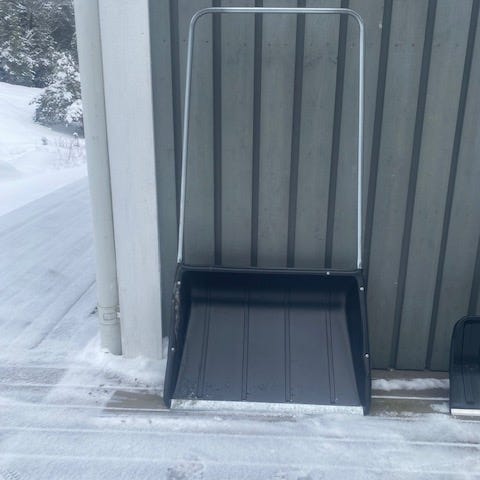 Erinomaisessa kunnossa oleva sininen lumikola. Lapion kauha on sinistää muovia, jossa on useita vahvikekiskoja. Etureunassa on metallinen kulutuslista, joka helpottaa lumen irrottamista ja suojaa lapion reunaa. Varressa on metalliputkea työntökahvassa. Soveltuu pihan ja kulkuväylien lumen poistoon. Kolan leveys 85 cm.