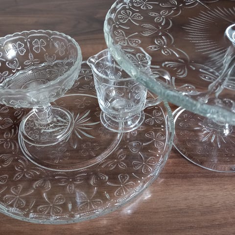 Lasinen kakkuvati jalallisella jalustalla. Vati on kirkasta lasia ja siinä on kohokuvioitu koristeellinen apila. Soveltuu kakkujen, leivonnaisten ja muiden tarjottavien esillepanoon ja tarjoiluun. Korkeus 14,5 cm ja halkaisija 26 cm.