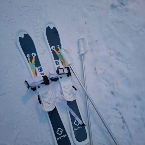 Hamax lasten sukset ja sauvat. Kenkiin kiinnitettävät ensisukset. Pari kertaa kokeiltu. Vain nouto.