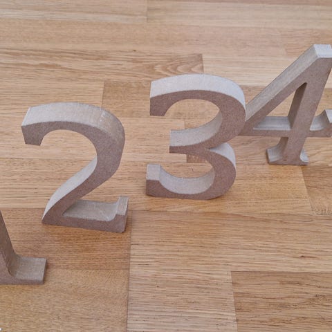 MDF levystä muotoon jyrsityt irto numerot 16mm paksut