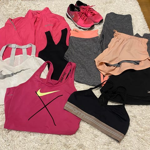 Mm. Kolmet urheilushortsit, toisen merkki Puma, toisia en tiedä ja kolmannet ovat AIM. Kahdet polyesteria, AIM-merkin ovat polyedia ja elastaania. Lukee kokolappu xl, mutta kyllä paljon pienemmät ovat. AIM-merkin on kokolappu S.