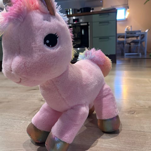 Build-A-Bear pehmokissa. Monivärinen pastellinsävyinen turkki, jossa vaaleanpunaisen, sinisen ja vihreän sävyjä. Pehmeä ja pörröinen materiaali, sopii sylileluksi tai sisustuselementiksi lastenhuoneeseen. Mahan kohdalla on hattaran tuoksu.