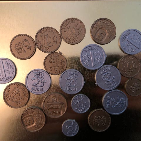 * ALGA : Leikki setelien summat ovat...: 5, 10, 50, 100, 200, 1000, 2000, 5000, 10000, 50000, 100000 + läjä muovisia kolikoita =)...