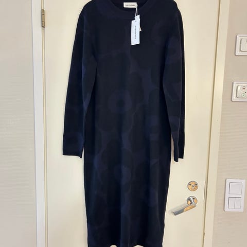 Tienoo Unikko jerseymekko . Mustapohjainen, tummansiniset Unikot, M koko, kai-kai 54 cm, olka-helma 117 cm.
