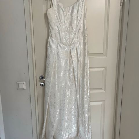 A-linjainen, koko 38 ja väriltään ivory. Todella kauniit, laadukkaat kirjailut. Lisäksi hyvin tuettu "korsetti" -yläosa jossa vetuketju, joten helppo pukea. Puku on paksua satiinia jonka päällä on tyllikangas jossa kirjailut.