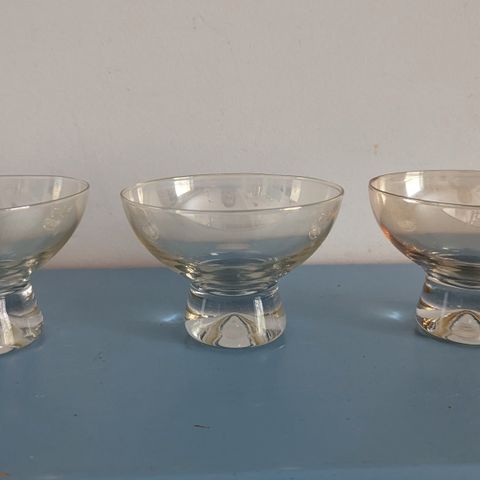 Lasikulhot jalallisina, yhteensä 3 kappaletta. Kulhot ovat eri väreissä: sinertävä, kellertävä, vihertävä. Materiaalina on värillinen lasi ja jalkaosa on kirkasta lasia. Sopivat esimerkiksi jälkiruoille, pienille tarjoiltaville tai koristekäyttöön.