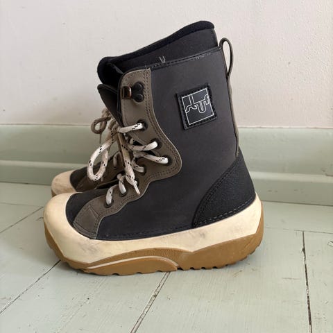 Talapus Junior lumilautakengät lapsille. Kengän koko EUR 33 2/3 (UK 1,5 / USA 2,0 / 21 cm). Väri musta–keltainen harmailla yksityiskohdilla. Nauhoitus pikakiinnityksellä helpottaa pukemista ja säätöä. Kengissä on pehmustettu varsi ja vuori, jotka tukevat ja lämmittävät jalkaa lumilautailussa.