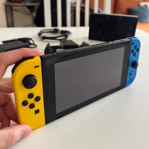 Settiin kuuluu itse konsolin lisäksi myös kaikki tarvikkeet mitä sen kanssa on alunperin tullut mukana, eli lataustelakka ja latausjohto sitä varten, sekä myös joyconien lisäosat.