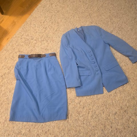 Pitkä kapea hame vetoketjukiinnitys alhaalta vyötäröön asti, syvä halkio edessä. Vyötärön ympärys noin 84 cm. Samaa sävyä pleiseri, vetoketju, 2 taskua joissa vetoketjukiinnitys. Pienet olkatoppaukset. Pleiserin sivuilla halkiot tilaa antamaan. Kai-kai 55cm. Erittäin vähän käytetty. Myydään yhdessä tai erikseen. Yht 20€.