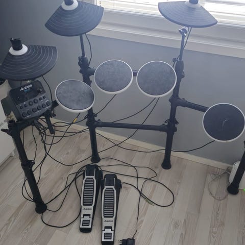 Alesis DM LITE sähkörummut. Setissä on useita rumpupadeja ja symbaalipadeja sekä kaksi jalkapoljinta. Ohjainmoduulissa on useita säätimiä ja liitäntöjä eri äänille ja toiminnoille. Soveltuu sähkörumpujen soittoon ja harjoitteluun kuulokkeilla tai vahvistimen kautta.