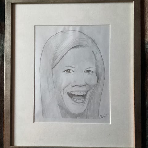 Kehystetty muotokuva lyijykynäpiirroksena. Teoksessa on esitetty naishahmon kasvokuva. Piirros on tehty valkoiselle paperille ja se on asetettu paspikseen sekä yksinkertaiseen kehykseen. Sopii esimerkiksi sisustuselementiksi seinälle tai lahjaksi taiteesta kiinnostuneelle. Signeeraus EQ Halminen 2019.