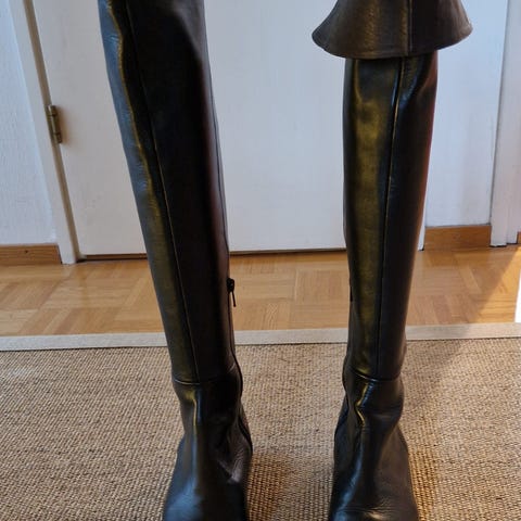 Stockmannilta ostettu espanjalaiset talvisaappaat . Yltävät polviin saakka . Ostin käytettäväksi hameen kanssa, mutta on kuitenkin jääneet käyttämättä. Kokeiltu on tietenkin. Vahva vetoketju , kunnon urapohja . Hyvää nahkaa ja kunnon karvavuori. Väri musta. Designmerkki kantapään kohdalla saappaan takapuolella. Hp posteineen 275 e.( maksoin 320e).