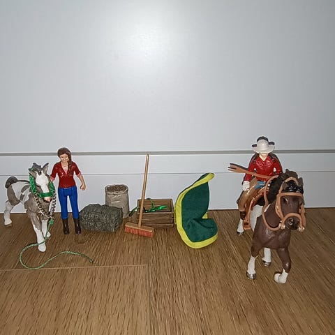 Schleich ratsukko, varsat, tytöt ym. Käytettyjä Schleichejä, jonkin verran leikin jälkiä.