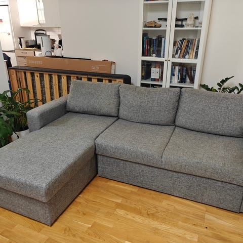 Harmaa vuodesohva divaanilla ja vuodevaatelaatikolla, kunto muuten hyvä mutta divaanin puoleinen käsinoja painunut sisään. Pari vuotta ollut käytössä, koiratalous.