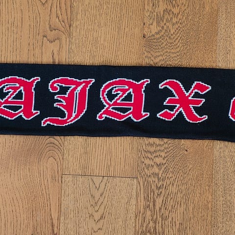 Myydään hyväkuntoinen Ajaxin jalkapallo kannatushuivi. Toisella puolella teksti AFC AJAX ja toisella AMSTERDAM.
