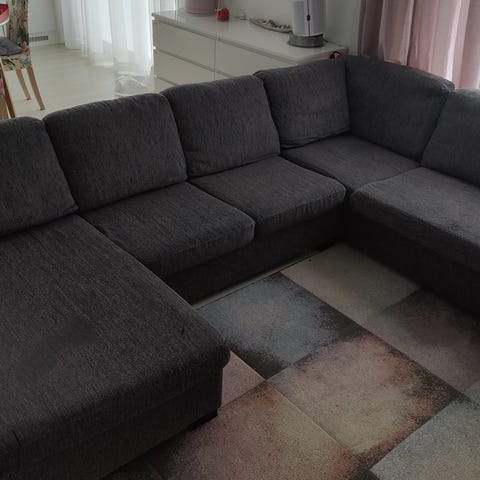 Huom! Eläintalous. Tummanharmaa kulmadivaanisohva. Sohvassa on L-mallinen kulmarakenne. 12 cm jalat, mahtuu robotti-imuri. Sohva useamman vuoden vanha, mutta hyvässä kunnossa. Harjattu ja imuroitu, mutta koirankarvoja löytyy.