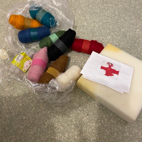 Neulahuovutukseen tarkoitettu alusta eli huovutusharja, kaksi neulapidikettä ja paketti varaneuloja.