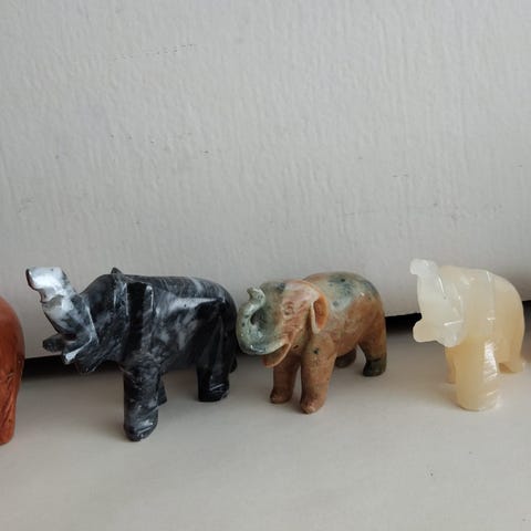 Iso kokoelma norsuja. Yhteensä 50kpl. Materiaalina puu, lasi, posliini, kivi.