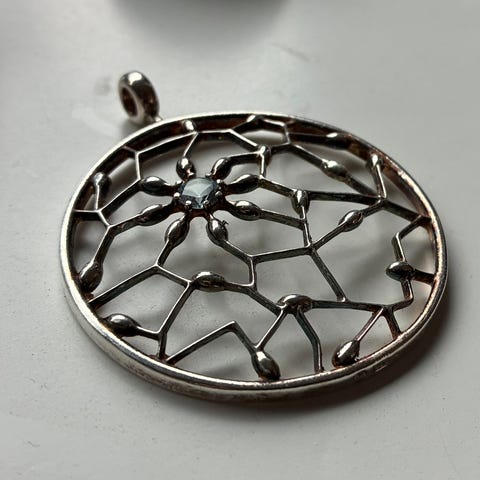 Kalevala Koru Carmen kaulakorun iso hopeinen riipus. Riipuksen leveys n. 5,5 cm. Kivenä syvän punainen granaatti.