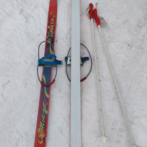 Myynnissä lasten sukset (100 cm) ja sauvat (95 cm)