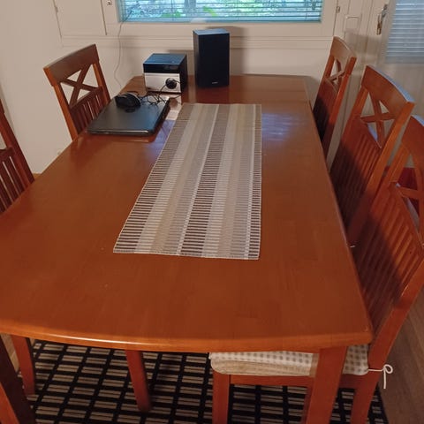 Myydään isomman tieltä tukeva ja siisti ruokapöytä ja 6kpl Iskun tuoleja. Eivät keiku tai notku. Massiivikoivua.