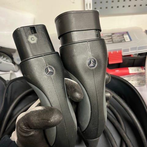 Mennekes sähköauton latauskaapeli keltaisella spiraalijohdolla.