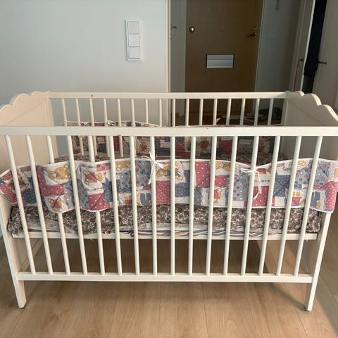 IKEA pinnasänky, väri valkoinen. Materiaalina puu, säleillä varustetut laidat ja puinen pohja. Sopii vauvalle ja taaperolle nukkumis- ja lepohetkiin. Sängyn ympärillä sälepinnat, jotka mahdollistavat ilmanvaihdon ja näkyvyyden. Yksinkertainen ja suorakulmainen malli, joka sopii useimpiin lastenhuoneisiin.