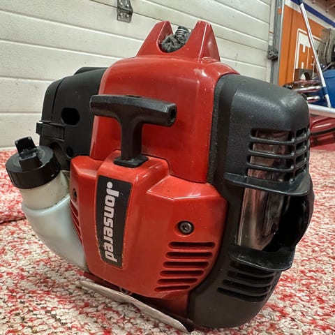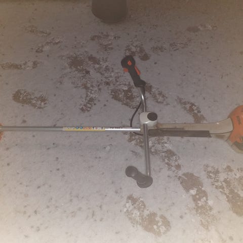 Myyd. Ruoho/Raivaussaha, siima, ruoho ja raivausterä, valjaat. Lähtee käyntiin, tankissa saumavuoto ylälaidassa. Joutilaana. Tied. Toriviestillä. En lähettele, vain nouto.