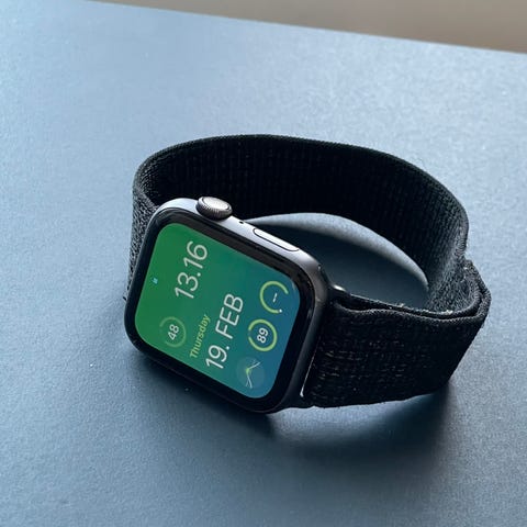 Apple Watch Series 4 44mm musta älykello. Mukaan tulee myös laturi sekä toinen Niken ranneke.