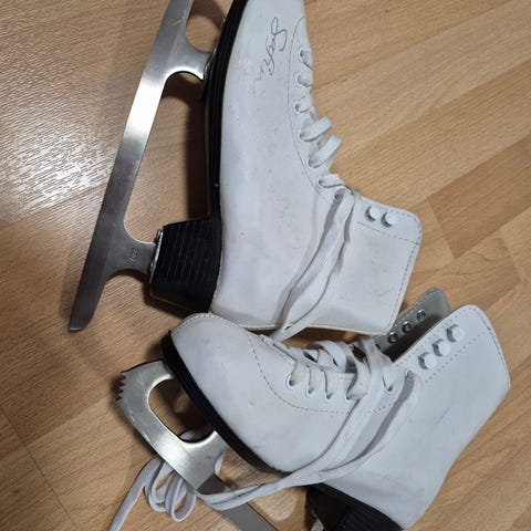 TecnoPro Safine taitoluistimet, koko 41. Väri valkoinen. Perinteinen nauhakiinnitys ja korkea varsi tukevalla nilkkatuella. Terät soveltuvat yleiseen luisteluun ja taitoluistelutyyppiseen käyttöön sisä- tai ulkojäällä.