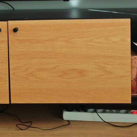 Tason takapuolelle tehty pieni neliöaukko, jotta johdot saa tason sisälle.