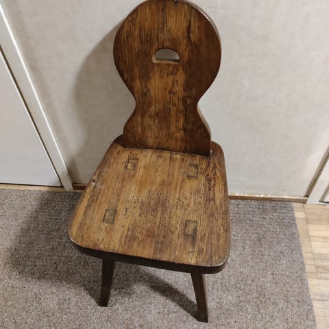 Talonpoikainen Vihreäksi maalattu massiivipuinen tuoli, maalipinnoissa ajanmukaista kulumaa.