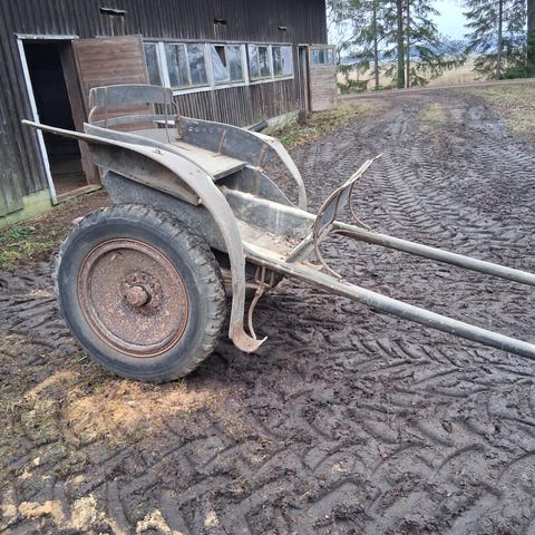 kunnossa olevat hevoskärryt istuin pehmuste puuttuu. Kärryt olleet heinien joukossa
