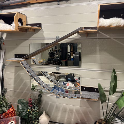 Käyttämättä jäänyt seinälle asennettava riippusiltahässäkkä kissalle. Käsityönä tehty. Ruuvit ja proput mukaan.
