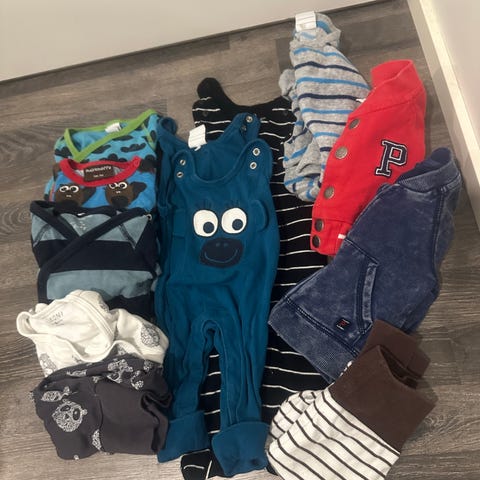 Pakettiin kuuluu useita bodyja, housuja, fleecehaalari ja neuletakki.