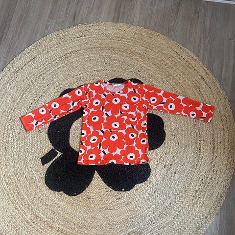 Marimekon unikko collegepaita pinkeillä piirtokukilla koossa 104-110. Yhdellä käytetty. Muuten tosi siisti,mutta hihan resoreissa vähän tummentumaa. En ole yrittänyt erityisesti poistaa, kun ei ole käyttöä häirinnyt, eikä pomppaa silmään.