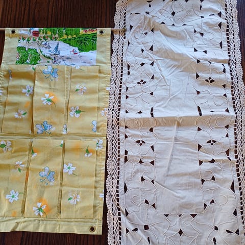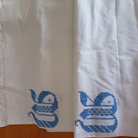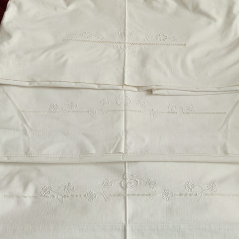 Myydään vanhat lakanat. 6 kpl. Kahdessa ainakin pieniä ruskeita jälkiä, näkyy kuvassa. Yhdessä lakanassa pitsi rikki. Pitsit kaikissa. Nimikoitu sukunimellä taitokseen, kun pesty pesulassa.