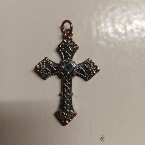 Kaulakoru, jossa riippuvana ristiriipus. Unisex-mallinen koru sopii käytettäväksi eri tyyleissä ja asukokonaisuuksissa. Materiaali on muuta kuin jalometallia. Kaulakoru on yksinkertainen ja pelkistetty, ja siinä on ketju sekä ristiriipus samansävyisinä. (Ostettu 10€)