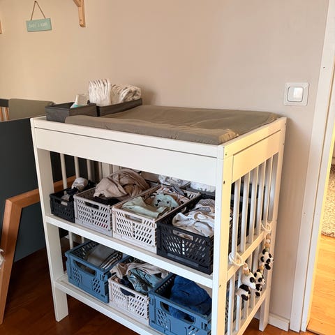 IKEA hoitopöytä, väri valkoinen. Hoitotaso ylhäällä ja kaksi avointa hyllytasoa alla tarvikkeiden säilytykseen. Soveltuu vauvan hoitoon ja vaipanvaihtoon. Materiaalina maalattu puu tai puupohjainen levy. Huonekalu on suunniteltu lastenhuoneeseen tai hoitonurkkaukseen.