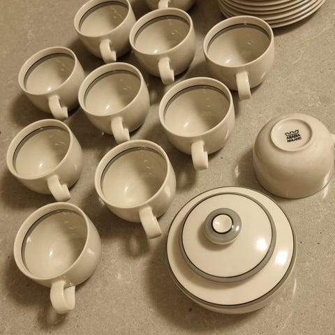 Arabian Airisto-sarjaa 11 kahvikuppia aluslatasineen sekä pullalautaset. Kupin vetoisuus n. 1dl, halkaisija 7,5cm. Postikulut ostajalle.