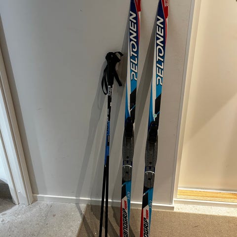 Meille uutena hankitut ja muutamiin hiihtokokeiluihin päässeet Peltosen sukset 100 cm ja sauvat 70 cm valmiina seuraavan käyttöön.